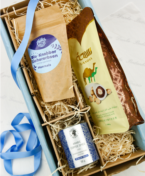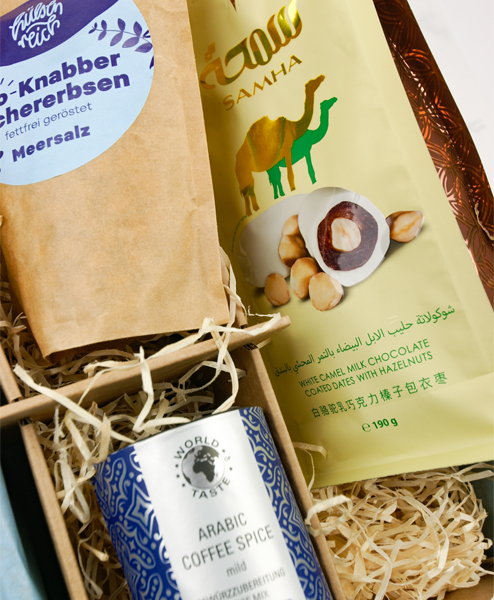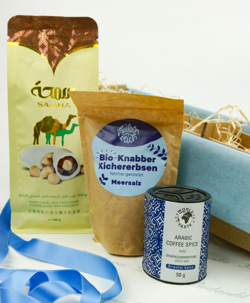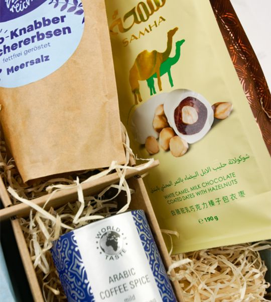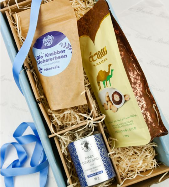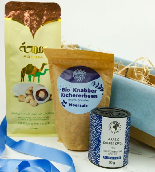 Dieses Feinkostpaket hat schon etws märchenhaftes, vor allem wenn der Beschenkte die Original Al Sanha Datteln mit Kamelmilchschokolade probiert. Die Schokolade heißt nicht Dubai Schokolade sondern ist wirklich aus Dubai. Sie wird nur dort von einem Schokolatier produziert, der die Wurzeln seiner Kunst im Kölner Schokoladenmuseum hat. Dazu haben wir ein typisch arabische Kaffeegewürz von World of Spice und gesalzene Bio Kichererbsen zum Knabbern arrangiert. Dieses Paket lässt ganz sicher alle Genießer von 1001 Nacht träumen.