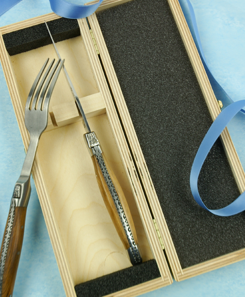 Aufbewahrungsbox für Laguiole Besteck (Messer, Gabel oder Kombi) mit zwei Plätzen. Gearbeitet aus Birkenschichtholz und massivem Birkenholz. Hochwertige Verarbeitung mit Messingbeschlägen und Schauminlays. Made in Germany.