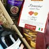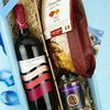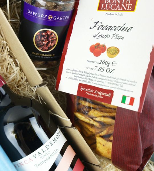 Geschenkbox mit Rotwein, Focaccine und Rauchmandeln