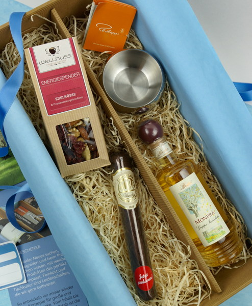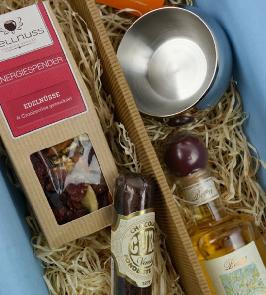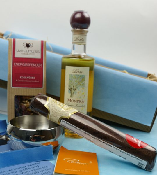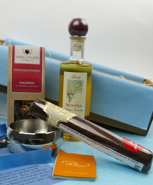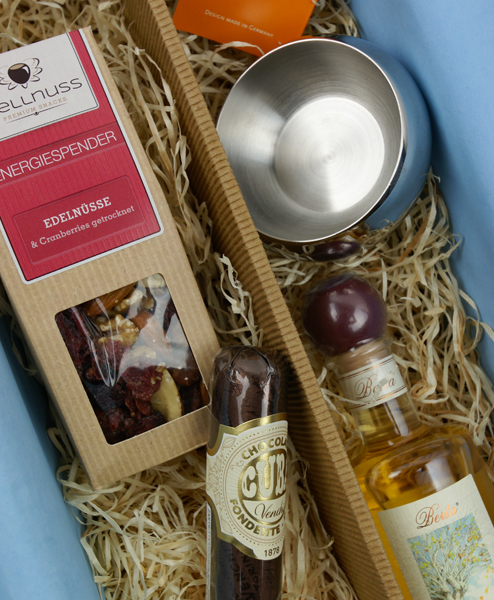 Als Aufmerksamkeit zur Dinnereinladung, zum gelungenen Vertragsabschluss oder einfach als Geschenk zu Weihnachten, After Dinner passt zu vielen Anlässen. Es vereint Feines mit Scharfem und Süßes mit Herzhaftem und ist somit ein Unisex Geschenk. Ein bisschen Dessert geht doch immer.Der Grappa Monprà aus der Traditionsdestillerie Berta in Italien hat seine goldene Farbe und das milde Aroma im Eichenfass bekommen. Die „Zigarre“ ist aus feinstem dunklen Nougat und ein weiteres Meisterstück aus der berühmten Confisserie Venchi. Für den herzhaften Knabberspaß sorgen die Edelnüsse mit Cranberry von Wellnuss, die sich hervorragend in der schönen Edelstahlschale „Coppetta” von Philippi servieren lassen.