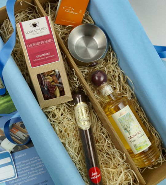 Geschenkbox mit Digestif und Schokolade