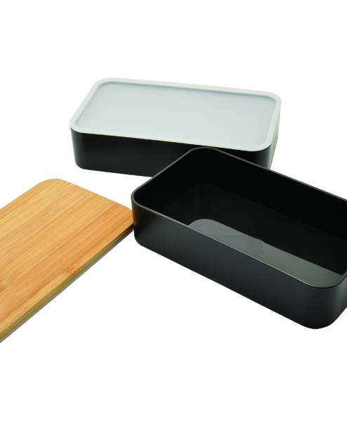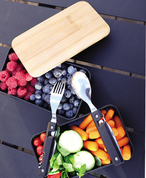 In dieser schönen, doppelstöckigen Lunchbox ist die Tradition des klassischen japanischen Bento stilistisch perfekt bewahrt. Das schlichte, elegante Design ist kombiniert mit ausgfeilter Funktion. Die beiden Etagen haben jeweils fest schließende Deckel und sitzen durch zusätzliche Dichtungen rutschfrei aufeinander. Den Abschluss bildet ein solider Bambusdeckel der zugleich als Schneidebrett dient. Das breite Gummiband hält alles zusammen und kann sehr gut als Halterung für ein Reisebesteck genutzt werden. Den Bento gibt es in weiß und schwarz.