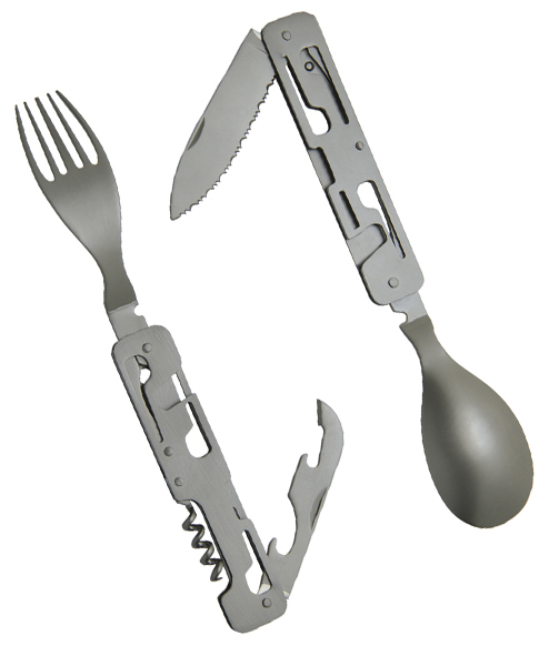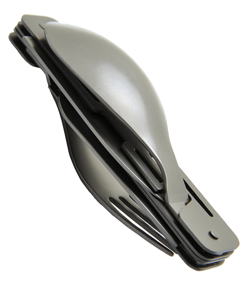 Das ultimative Survival-Besteck wenn jeder Zentimeter zählt. Zusammenklappen und ohne jedes Verletzungsrisiko einfach in die Jackentasche stecken. Die extrem durchdachte Konstruktion aus zwei Komponenten hat insgesamt 6 lebenswichtige Funktionen. Messer mit Wellenschliff, Gabel, Löffel, Dosenöffner, Kapselheber. und Korkenzieher. Dabei wiegt es quasi nichts.
