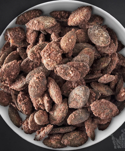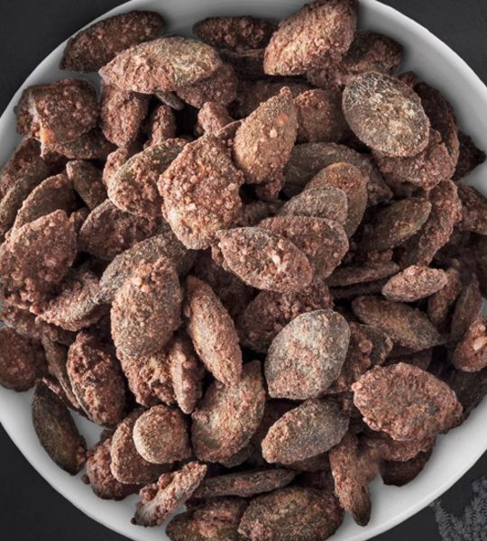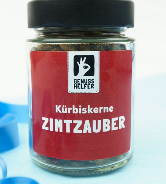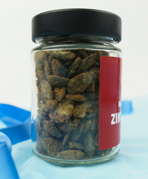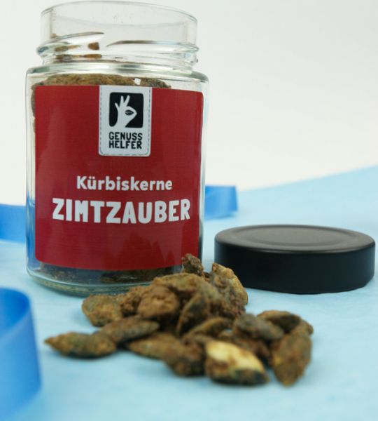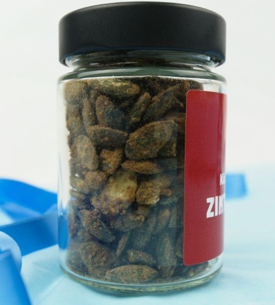 Dieser leckere Snack heißt „Zimtzauber“ und ist ein eigenes Rezept vom Bremer Gewürzhandel. Mit ein wenig Rohrzucker werden Kürbiskerne knusprig geröstet und mit einem exotisch-herzhaften Zimtmantel aus leckerem Ceylon-Zimt zu einem süß-würzigen Knabbersnack veredelt. Die Zutaten werden vom Bremer Gewürzhandel von Hand hergestellt und abgefüllt. Das ist 100 % Natur ohne Geschmacksverstärker, Rieselhilfen oder Ähnliches. Zimtzauber ist vegan und glutenfrei