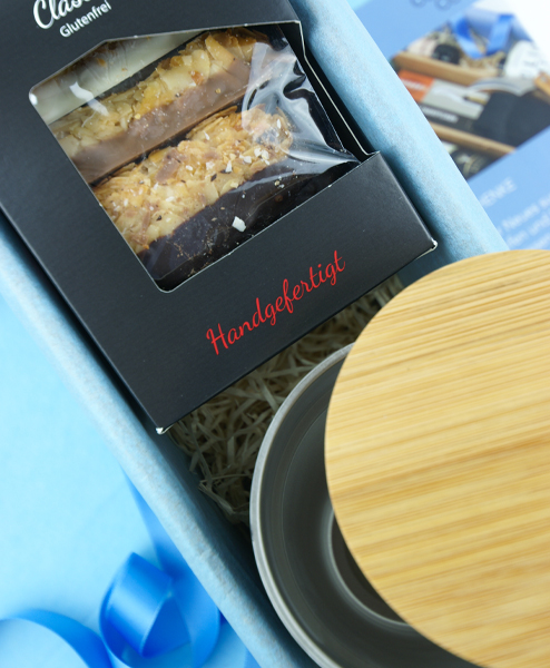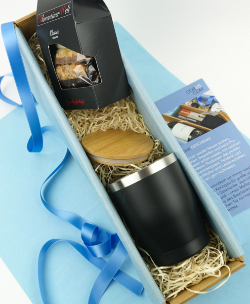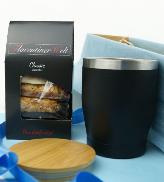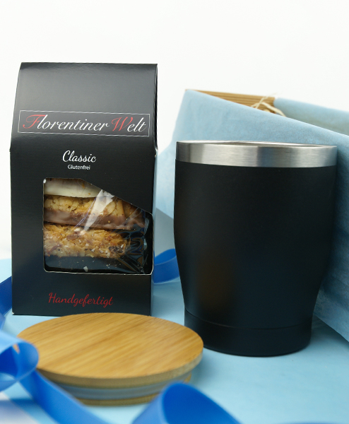 Mit Café Grande möchten wir Ihnen einen exklusiven Moment der Entspannung schenken. Genießen Sie ein bisschen Grandezza nur für sich mit einem großen Kaffee.Mit 300 ml fasst der doppelwandige Becher von Baladéo einen anständigen Schluck und hält in auch warm. Der Bambusdeckel mit Silikondichtung verhindert nicht nur das schnelle Auskühlen, sondern hält auch alles draußen, was nicht reingehört. Die Überraschung kommt, wenn der Beschenkte die handgemachten Mini-Florentiner dazu probiert. Das ist echte Grandezza für den Gaumen!