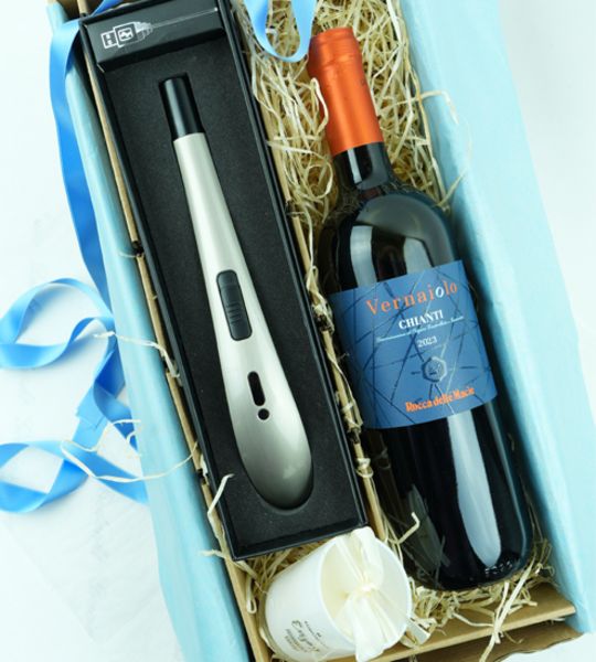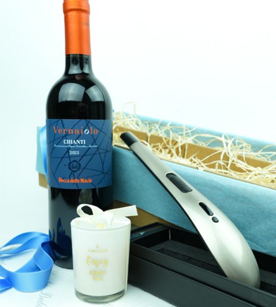 Geschenkbox mit Wein und Arc Flame und Kerze