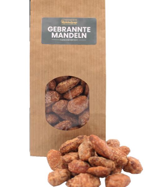 In der Confiserie Möhlenkamp wird Gebäck noch nach alter Bäckertradition in Handarbeit und nach eigenen Rezepten gefertigt. Wer soviel Engagement in seine Produkte investiert, achtet auch auf die Herkunft der Rohstoffe. So unterstützt die Confiserie vor allem den regionalen Anbau und den fairen Handel bei Gewürzen und Kakao. Die knusprigen gebrannten Mandeln schmecken wie direkt vom Weihnachtsmarkt und sind 6 Monate haltbar. Dieser leckere Saisonartikel wird speziell für seinen Einsatz auf dem Weihnachtsteller produziert. Personalisierung mit einem Sticker ab 100 Stück inklusive.