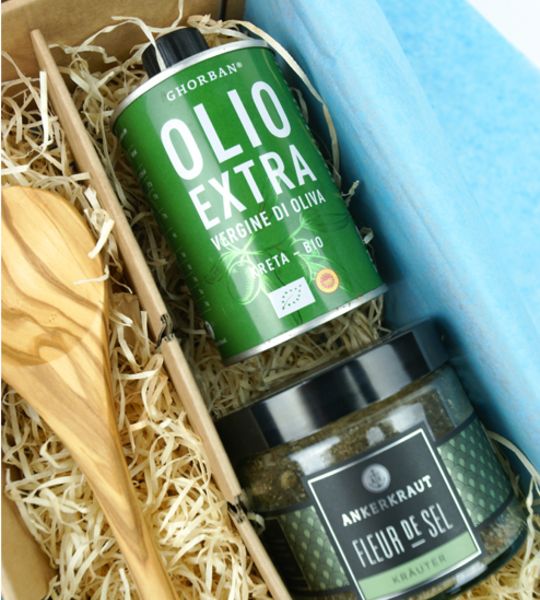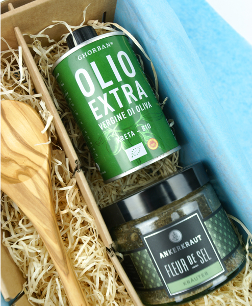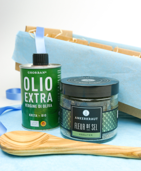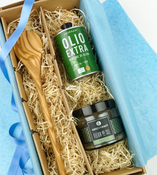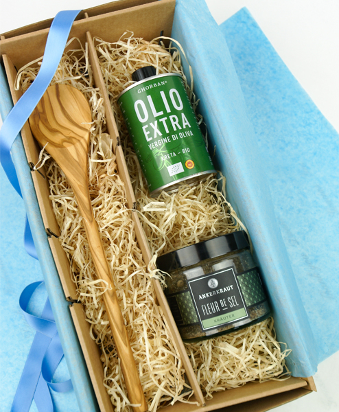 Olivenholzkochlöffel, Olivenöl und Fleur de Sel