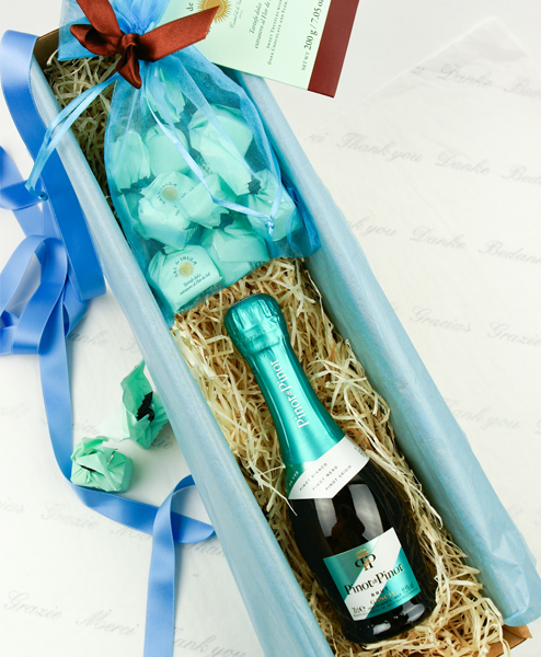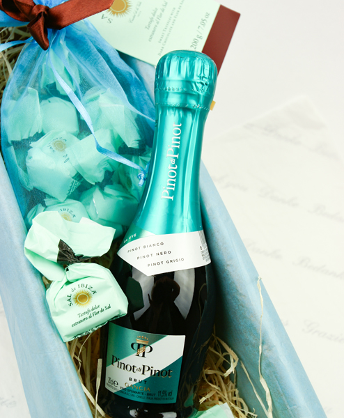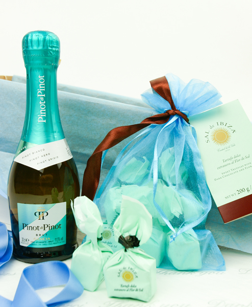 Manchmal muss es eben "Das kleine Grüne" sein. Mit dieser optisch wie geschmacklich eleganten und hochwertigen Kombination sind Sie immer "well-dressed" wenn es um ein kleines aber edles Geschenl geht, Die Piccoloflasche Pinot di Pinot Brut von Gancia ist wirklich eine positive Überraschung. Es gibt wenig Brut Sekte, die ihren Geschmack auch in der Piccolo Flasche behalten, aber hier ist das gelungen. Quasi der Glitter auf der Zunge, sind die zart schmelzenden Tartufi aus extradunkler Schokolade mit Flor de Sal von Sal de Ibiza.