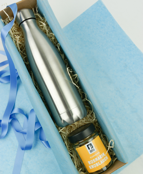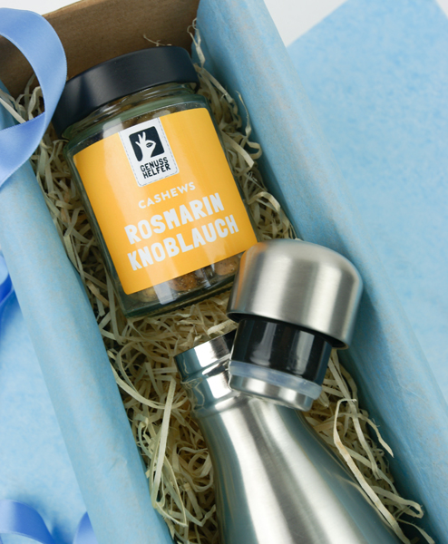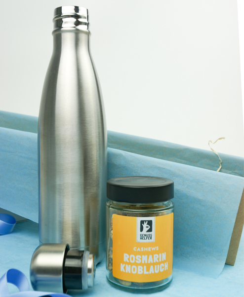 Snack and Drink ist ein nachhaltiges Geschenk als Incentive oder zum Onboarding neuer Mitarbeiter. Die Original "Reumbler" Thermostrinkflasche fasst 500 ml heißes oder kaltes Getränk und hält mit dem doppelwandigen Edelstahl lange die Temperatur. Der Deckel hält auch dicht, wenn es mal rund geht. Als Nervennahrung sind die innovativen Cahsew mit mediterranem Gewürz allen Situationen gewachsen. Dieses Geschenk werden die Mitarbeiter gerne überall benutzen und mit einer Lasergravur trägt es lange Ihr Firmenimage.