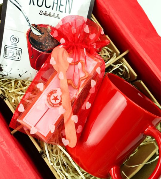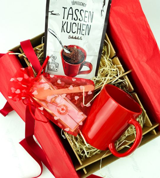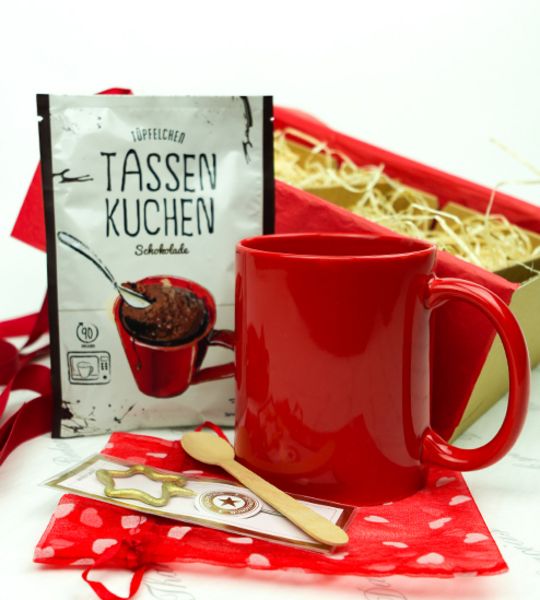 Dieses Geschenkset ist wie eine herzliche Umarmung. Mit der kleinen aber feinen Aufmerksamkeit drücken Sie Ihre Wertschätzung aus. Spaß und Genuss sind hier herzlich vereint. Die gebrauchsfertige Tassenkuchenmischung ist auf die schöne Tasse von Kössinger/Senator angepasst und ergibt einen sensationell leckeren Schokoladenkuchen. Zum Schluss die Wunderkerze reinstecken und feiern. Ein tolles Geschenk zu Weihnachten oder als Mitarbeitermotivation für ganze Teams. Den innen und außen farbigen Becher kann man in verschiedenen Farben bekommen.