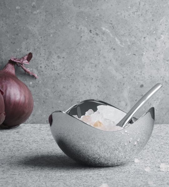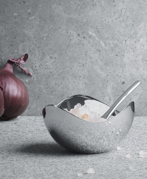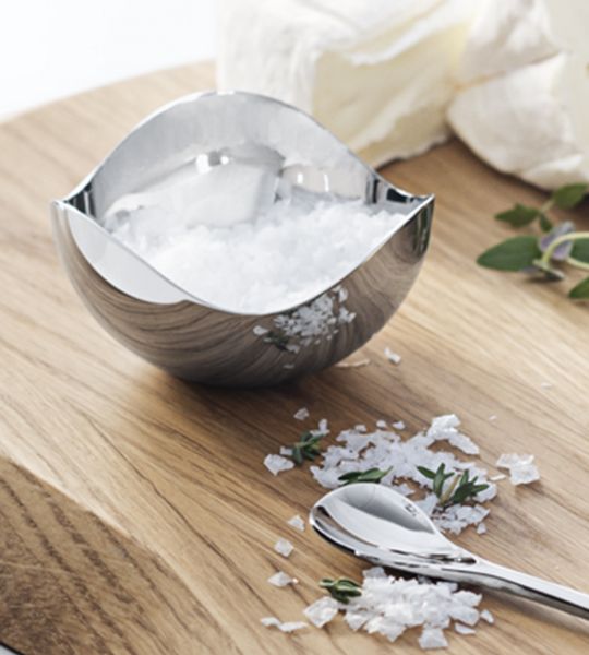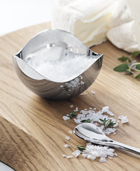 Der Salznapf aus der Serie „Bloom" von Georg Jensen, verdankt seinen Namen und seine Form der Inspiration des Designers Georg Jensen durch eine Kirschblüte. Die kleine hochglanzpolierte Schale mit dem passenden Löffel ist ein Highlight auf jedem Tisch. Darin servieren Sie stilecht hochwertige Salzflocken.