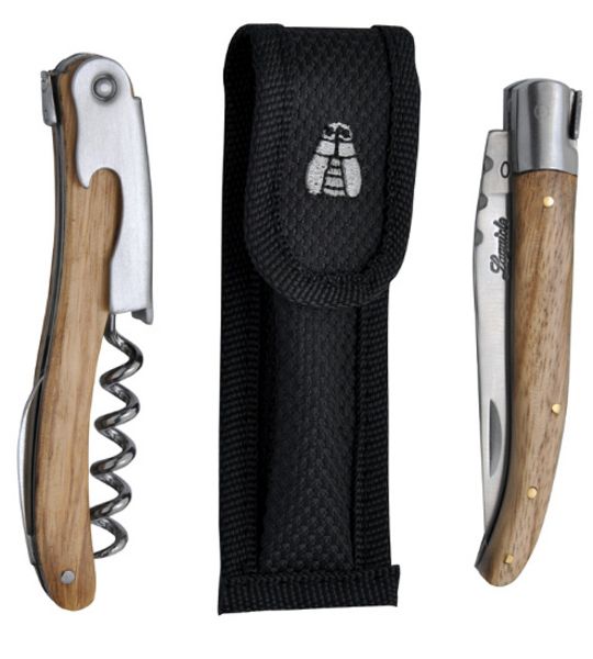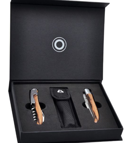 Das Set „Duo" von Baladéo ist mit seiner schlichten und natürlichen Eleganz ein zeitloses Geschenk für Naturliebhaber und Weinfreunde, die beim Picknick nicht nur Wert auf Praxistauglichkeit sondern auch auf Stil legen. Mit dem Kellnermesser lässt sich der Wein perfekt öffnen, während die Begleitung schon mal das Obst oder andere Köstlichkeiten schneidet. Die Messer haben sehr schön gemaserte Griffschalen aus Eschenholz, ein fein ziseliertes Rückenornament und das klasische Bienenmotiv. Damit man die Hände frei behält, ist im Set auch Gürteletui enthalten.