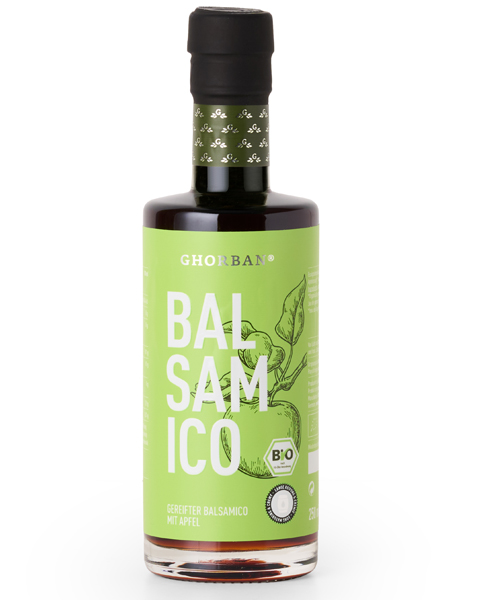 Wie alle GHORBAN® Balsamicoprodukte wird auch der Apfel Balsamico in traditionellen Verfahren in der Ursprungsregion des Balsamico, der Provinz Modena, hergestellt. Die Trauben wachsen auf regionalen Weinbergen und werden in Handarbeit geerntet. Alle GHORBAN® Balsamico-Varianten kommen ohne Zuckerzusatz aus. Seine Süße und die leicht cremige Konsistenz erhält dieser dickflüssige Balsamico durch gekochten Traubenmost, der in einem aufwändigen Prozess eingerührt wird. Erst muss der Balsamico mindestens 10 Jahre in Kastanienholzfässern reifen um das Prädikat „Invecchiato“ zu erhalten, dann wird frischer Saft vom Äpfeln hinzugegeben und nach weiterer Reifung entsteht dieses Spitzen-BIO-Produkt. Er ist eine raffinierte Veredelung von Desserts, Salaten oder Soßen und eine erfrischende Zugabe in Prosecco.