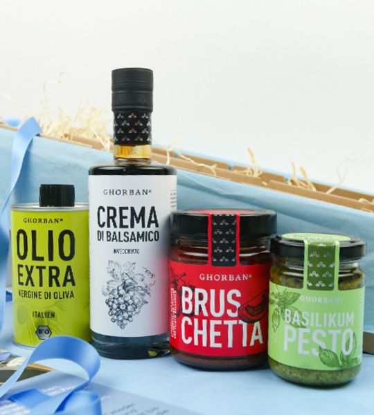 Ein typisch italienisches Abendessen ist mit diesem Paket leicht gemacht. Hier finden Sie die perfekte Grundausstattung. Es geht los mit einem klassischen Antipasti – der Tomaten Bruschetta auf warmem Brot, gefolgt von einer Insalata mit Olivenöl und Balsamico, zum Primo dann Spaghetti mit Basilikumpesto. Buon appetito!