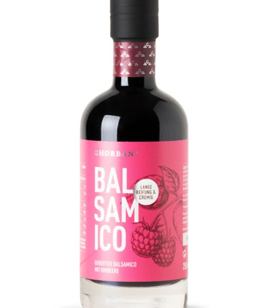 Wie alle GHORBAN® Balsamicoprodukte werden auch der Himbeer Balsamico in traditionellen Verfahren in der Ursprungsregion des Balsamico, der Provinz Modena, hergestellt. Die Trauben wachsen auf regionalen Weinbergen und werden in Handarbeit geerntet. Alle GHORBAN® Balsamico-Varianten kommen ohne Zuckerzusatz aus. Seine Süße und die leicht cremige Konsistenz erhält dieser dickflüssige Balsamico durch gekochten Traubenmost, der in einem aufwändigen Prozess eingerührt wird. Erst muss der Balsamico mindestens 10 Jahre in Kastanienholzfässern reifen um das Prädikat „Invecchiato“ zu erhalten, dann wird frischer Saft vom Himbeeren hinzugegeben und nach weiterer Reifung entsteht dieses Spitzenprodukt. Er ist eine raffinierte Veredelung von Desserts, Salaten oder Soßen und eine erfrischende Zugabe in Prosecco.