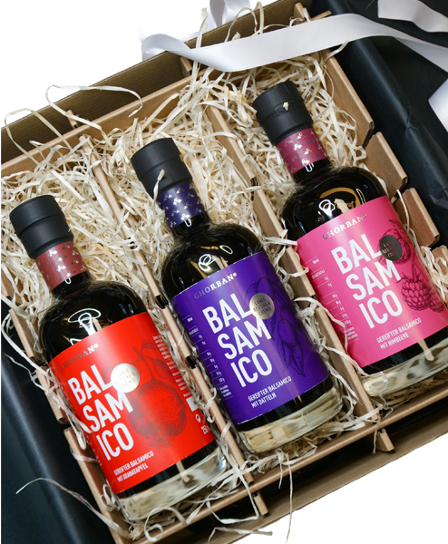 Geschenkpaket mit drei Sorten Balsamico mit Frucht