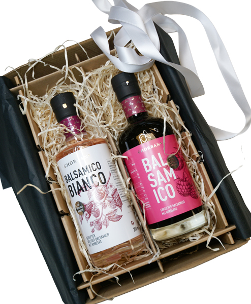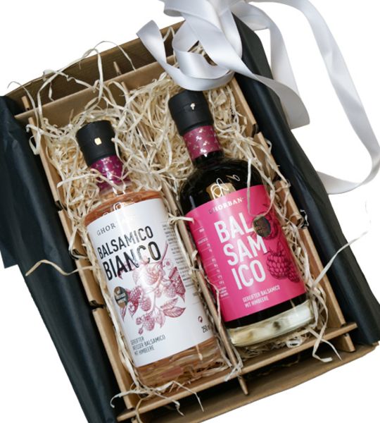 Geschenkpaket mit weißem und schwarzem Himbeer Balsamico