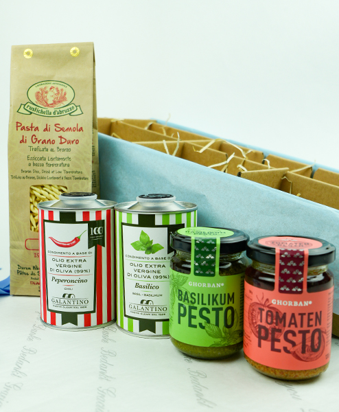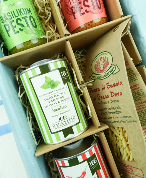 Geschenkpaket mit Pesto, Olivenöl und Tomatensauce