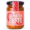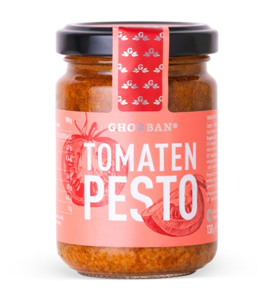 Wie das GHORBAN® Pesto Genovese wird auch das Tomaten-Pesto von einem kleinen Handwerksbetrieb mit viel Liebe und nach alter Tradition hergestellt. Die neue Edition hat sich optisch etwas verändert und auch die Rezeptur ist noch besser geworden. Bei der Qualität macht Ghorban keine Kompromisse. Nach wie vor bilden getrocknete Tomaten, kombiniert mit frischen Tomaten, echtem Parmesankäse, Cashewkernen und unserem Olio Extra Vergine di Oliva die Grundlage für das Pesto. Beim „pestare“ – übersetzt „stampfen“ – wird alles vermischt, mit erntefrischem Genoveser Basilikum abgeschmeckt und frisch abgefüllt. Einfach kalt unter heiße Pasta gemischt ist es ein Genuss für Liebhaber von Tomaten-Basilikum-Aromen. Sehr zu empfehlen auch als Aufstrich auf warmem Weißbrot.