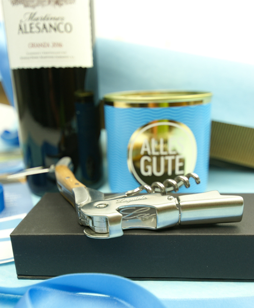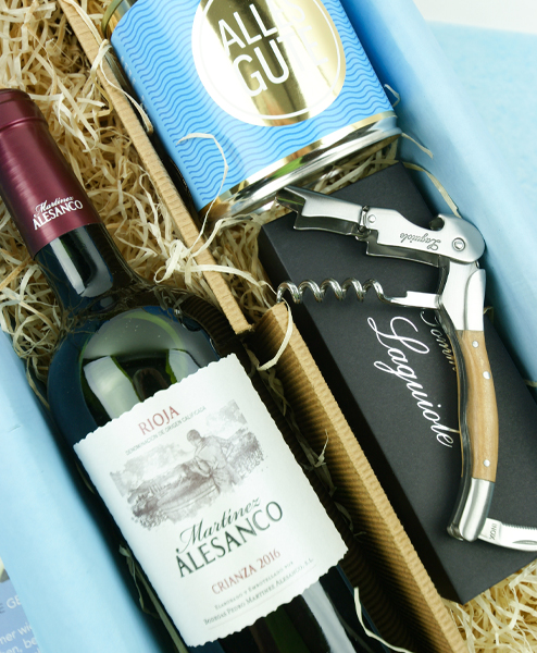 Es gibt viele Anlässe, besonderen Menschen eine Freude zu machen. Mit dieser Geschenkbox möchten wir vor allem Liebhaber eines guten Rotweins „happy” machen. Der Crianza aus der Bodega von Martinez Alesanco spiegelt die jahrhundertelange Tradítion des Weingutes wider. Er überzeugt durch ein volles Bouquet und einen samtweichen Geschmack ohne Tanin. Mit dem edlen Klassiker unter den Kellnermessern können Sie die Flasche angemessen stilecht öffnen und der „Cancake” Schoko-Marzipan ist ein Highlight für sich.