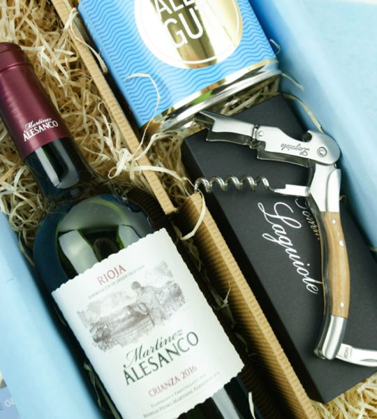 Es gibt viele Anlässe, besonderen Menschen eine Freude zu machen. Mit dieser Geschenkbox möchten wir vor allem Liebhaber eines guten Rotweins „happy” machen. Der Crianza aus der Bodega von Martinez Alesanco spiegelt die jahrhundertelange Tradítion des Weingutes wider. Er überzeugt durch ein volles Bouquet und einen samtweichen Geschmack ohne Tanin. Mit dem edlen Klassiker unter den Kellnermessern können Sie die Flasche angemessen stilecht öffnen und der „Cancake” Schoko-Marzipan ist ein Highlight für sich.