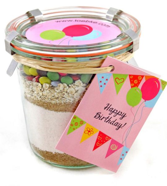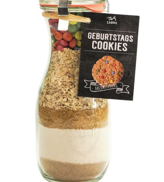 Die Backmischung für den Happy Birthday Kuchen im Weckglas sieht toll aus und überrascht mit bunten Schokolinsen als Topping. Ein wunderbares Geschenk für die Geburtstage Ihrer Mitarbeiter. Nur noch Butter und Eier hinzufügen. Mit der gut beschriebenen, leichten Zubereitung erzielt der Beschenkte sicher ein schönes Erfolgserlebnis. Es gibt die vom Hof Löbke mit viel Erfahrung zusammengestellten Mischungen mehreren Varianten. Die Weckgläser sind über Etiketten oder Anhänger personalisierbar. Die Backmischungen haben ein langes MHD.