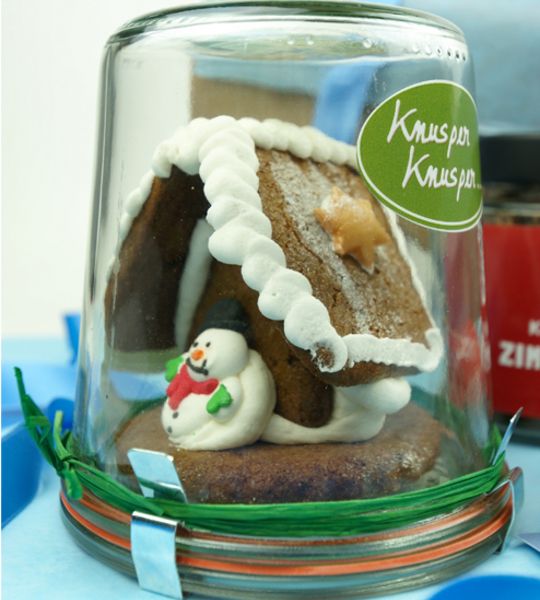 Ja, das ist eigentlich zu schön zum Essen, aber man kann es ja erst mal anschauen und dann trotzdem genießen. Dafür haben sich die Zuckerbäcker vom Hof Löbke schließlich so viel Mühe gemacht. Das Knusperhäuschen besteht aus feinstem Honig-Lebkuchen und ist klasssich mit Eischnee- und Zuckermasse dekoriert. Damit es heil beim Beschenkten ankommt ist es mit Zuckerkleber am Glasboden fixiert. Ein Hingucker, der ohne Worte Wertschätzung ausdrückt.