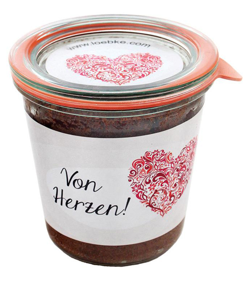 Dieser leckere Schokoladen-Kuchen wird direkt im Weckglas mit Liebe gebacken. Mit dem schönen "Von Herzen" Etikett ist er ein wunderbares Mitarbeiter oder Kunden-Geschenk für viele Anlässe. Die Weckgläser sind über Etiketten oder Anhänger personalisierbar. Die Kuchen im Glas haben ein langes MHD von über einem Jahr