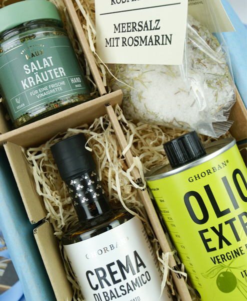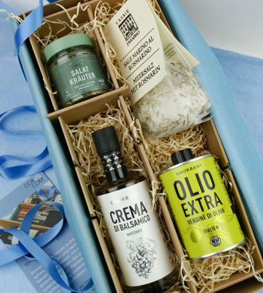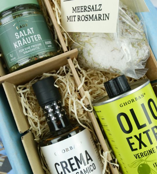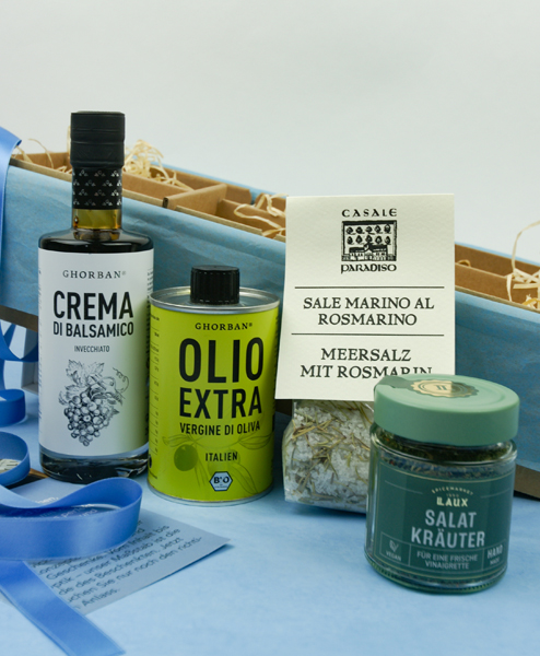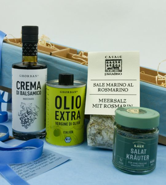 Die Crema di Balsamico ist ein italienischer Klassiker und das Bio Olivenöl Extra Vergine schmeckt intensiv und fruchtig. Mit den italienischen Kräutern bereiten Sie im Handumdrehen eine mediterrane Salatmarinade und das Meersalz mit Rosmarin rundet alles duftend ab.