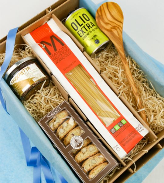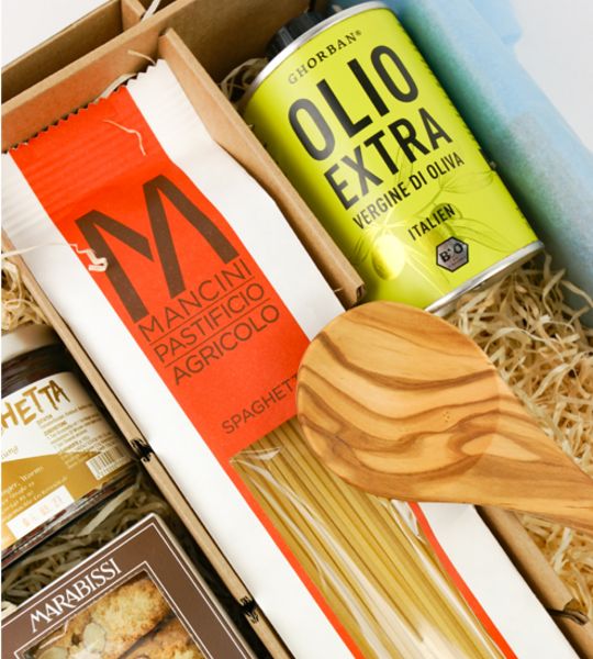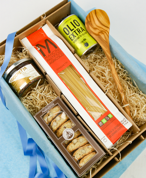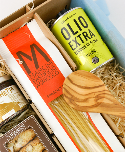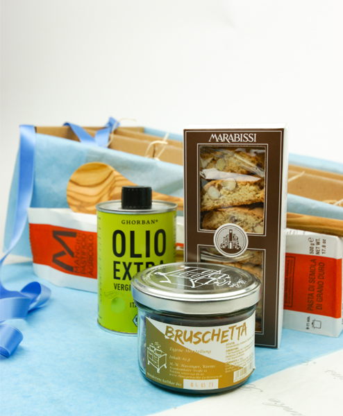 Wir wünschen viel Spaß beim Kochen und noch mehr beim Genießen. In diesem Feinkostgeschenk sind einige Zutaten für ein klassisches italienisches Menü. Es geht los mit Bruschetta als Antipasto, dann folgen fantastische Spaghetti von Mancini und zum guten Schluss noch handgemachte Cantuccini von Marabissi. die zum Kaffee oder zum Vinsanto passen. Natürlich fehlt auch das Werkzeug nicht und damit der stilechte runde Kochlöffel aus geschmeidigem Olivenholz.