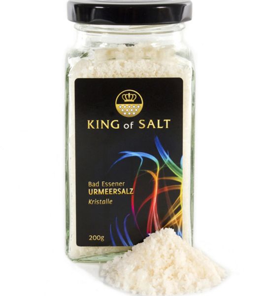 Umweltgeschützt in 800m Tiefe unter Bad Essen liegt ein Urmeer. Dieses weltweit einzige Vorkommen hat einen außergewöhnlichen Mineralgehalt von 31,5%. Das Salz kommt flüssig aus der Erde und wird in einem vom Familienbetrieb ”King of Salt" speziell entwickelten Verfahren kristallisiert. Dabei bleiben alle Mineralien erhalten und geben dem Knuspersalz sein unverwechselbares Aroma. Perfekt mit Olivenöl auf Weißbrot.