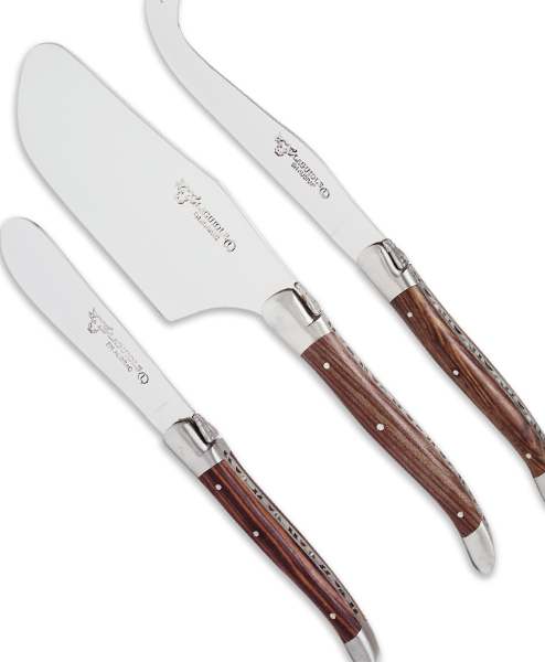 Wunderschönes 3teiliges Set aus Käsemesser, Käsebeil und Butterstreichmesser. Klassische Form mit Rückenornament und Biene, Backen matt gebürstet. Hier mit Griffen aus Wacholderholz. Das Set ist auch mit anderen Griffen aus Holz oder Horn erhältlich, passend zu allen Laguiole en Aubrac Bestecken. Das Set wird in einem schönem Kästchen aus Eichenholz mit Laguiole Logo geliefert.