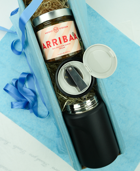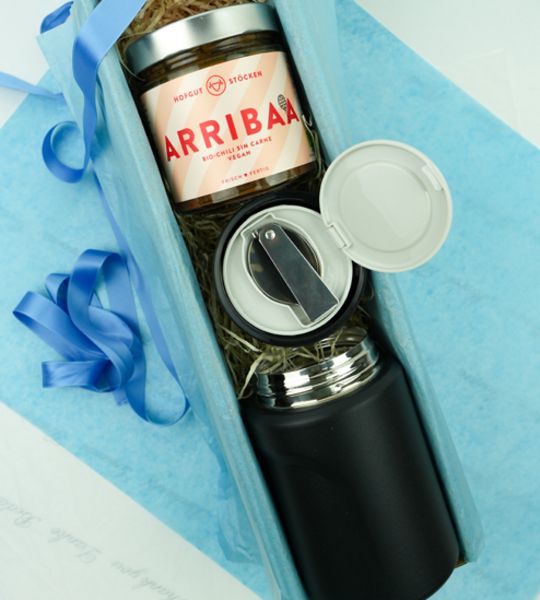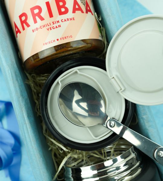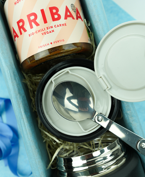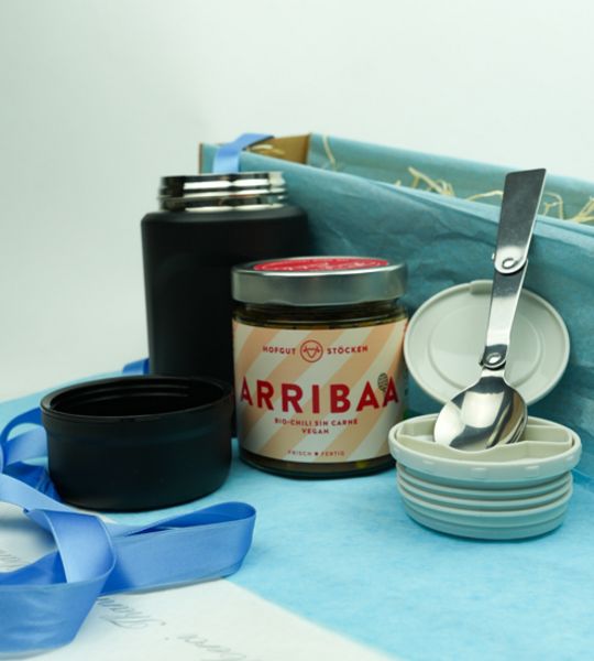 Wir wünschen eine erholsame und genussvolle Mittagspause jenseits von Kantine oder Fastfood. In diesem doppelwandigen und dichten Behälter können Sie Ihr Lieblingsessen einfach mitbringen. Der Thermosbento hält viele Stunden warm oder kalt und hat als Besonderheit das Besteck noch gleich im Deckel integriert. Als kulinarisches Highlight haben wir Ihnen das Chili sin Carne vom Bio Hofgut Stöcken mit eingepackt. Das ist lecker und gibt Energie.