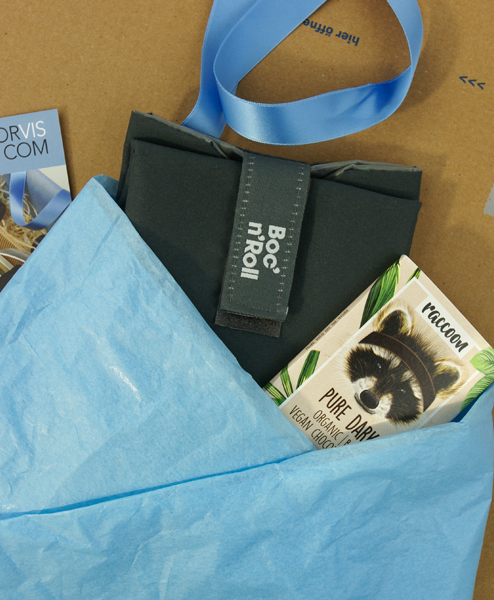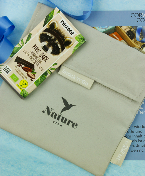 Mit Lunch to go machen Sie Ihren Kunden und Mitarbeitern eine nachhaltige Freude. Anstelle das Sandwich, den Snack oder das Obst in Folie, Aluminium oder Papier einzuwickeln, kann der Beschenkte nun alles in den wiederverwendbaren und waschbaren Lunchbag packen oder rollen. Die Snack'n'Go Variante hat genau die richtie Größe für ein Butterbrot oder einen Snack, das Boc'n'Roll hingegen ist mit 54 x 32 cm auch für den größern Hunger gut. Beide sind sehr schön personalisierbar und passen mit der kleinen veganen Schokoladentafel perfekt in einen Buchumschlag oder einen Maxibrief.
