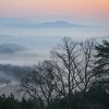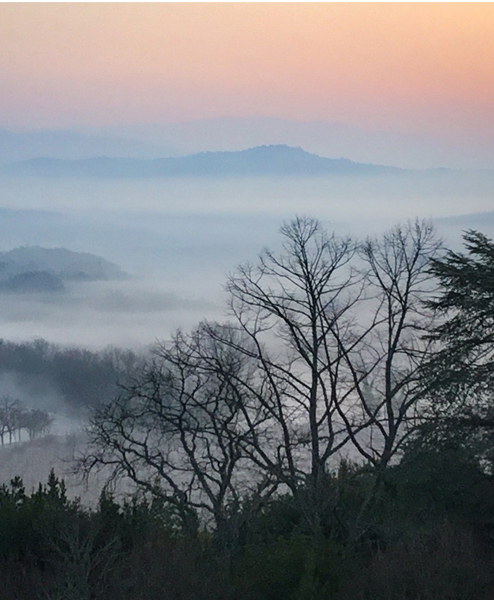 Morgenstimmung mit Nebel und Sonnenaufgang über den Hügeln der Toskana