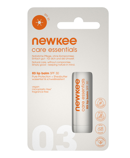Der vegane und parfümfreie newkee lip balm SPF 30 bewahrt die Lippen mit hohem Lichtschutzfaktor vor UVA- und UVB-Strahlen. Mit seinen natürlichen Inhaltsstoffen eignet er sich auch für trockene und rissige Lippen.