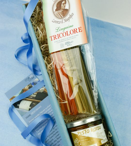 Da wird es bunt auf dem Teller. Das sieht nicht nur toll aus, sondern schmeckt auch lecker, denn gefärbt wird nur mit natürlichen Zutaten wie Spinat und Chili. Die original italienische Harrzweizenpasta von Lorenzo il Magnifico macht aus dem Klassiker unter den Pastagerichten eine farbenfrohe kulinarische Besonderheit. Dazu passen die exklusiven Pestovariationen von „Alles Gute Feinkost” ausgesprochen gut. Hier das Pesto Rosso aus getrockneten Tomaten und Kräutern.