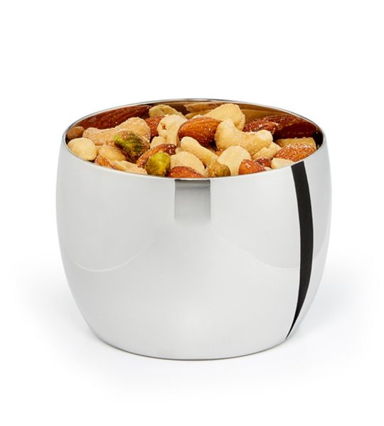 Die Cocktailschale „Coppetta" von Philippi ist doppelwandig aus glänzendem Edelstahl gefertigt und hebt so ihren Inhalt leicht empor. Mit ihren unauffälligen Maßen von gerade einmal 9 cm Durchmesser ist sie ideal für die angemessene Präsentation von Knabbereien aller Art oder hochwertiger Salze. Sie ist mit ihrem schlichten und eleganten Design ein Glanzpunkt auf jedem Tisch.
