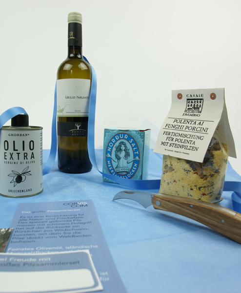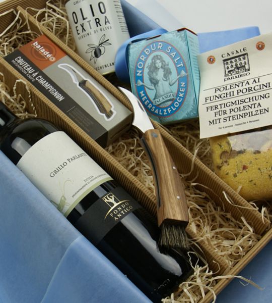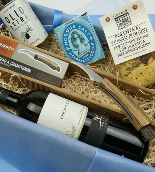 Das große Pilzsammlerset ist eine Bereicherung für alle Hobby-Küchenchefs, die gerne selbst in der Natur nach Zutaten suchen. Das speziell geformte Pilzmesser von Baladéo mit schönem Holzgriff hat auf der Rückseite ein Bürstchen aus Wildschweinborsten, mit dem Sie die Pilze direkt vom Waldboden befreien.Mit feinstem Bio Olivenöl, isländischen Meersalzflocken und einer traditionellen Polenta bereiten Sie Ihre Beute stilecht zu. Die Polenta ist mit echten getrockneten Steinpilzen und Gewürzen vorbereitet und ganz leicht zubereitet. Der Weißwein „Grillo Parlante" ist ein wunderbarer Begleiter für diesen Genuss.