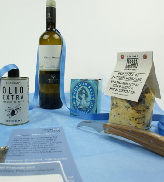 Das große Pilzsammlerset ist eine Bereicherung für alle Hobby-Küchenchefs, die gerne selbst in der Natur nach Zutaten suchen. Das speziell geformte Pilzmesser von Baladéo mit schönem Holzgriff hat auf der Rückseite ein Bürstchen aus Wildschweinborsten, mit dem Sie die Pilze direkt vom Waldboden befreien.Mit feinstem Bio Olivenöl, isländischen Meersalzflocken und einer traditionellen Polenta bereiten Sie Ihre Beute stilecht zu. Die Polenta ist mit echten getrockneten Steinpilzen und Gewürzen vorbereitet und ganz leicht zubereitet. Der Weißwein „Grillo Parlante" ist ein wunderbarer Begleiter für diesen Genuss.