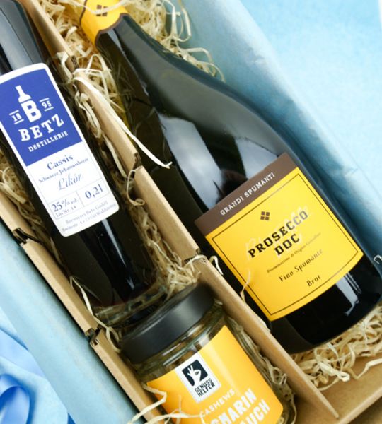 Geschenkbox mit Prosecco, Creme de Cassis und Kürbiskernen