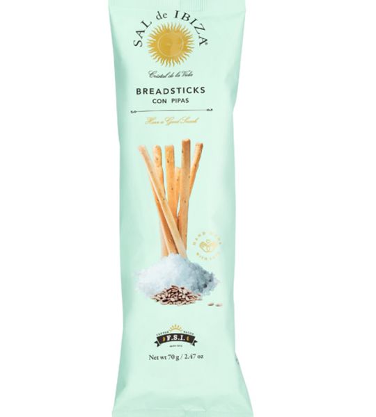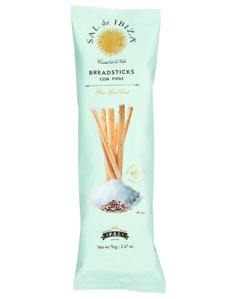 Die nussigen Sonnenblumenkerne machen aus einem Grissino den idealen Begleiter zu Cocktails. Mit dem eleganten Flor de sal aus Ibiza gewürzt sind diese handgerollten Stangen ein sehr geschmackvolles, rustikales Statement.
