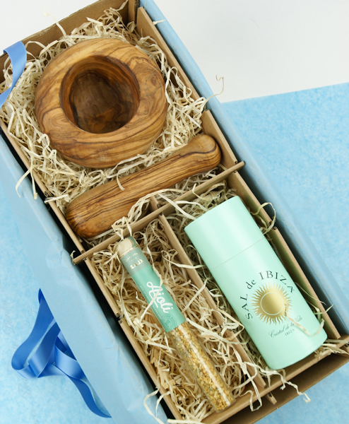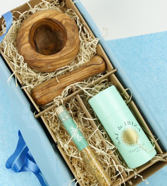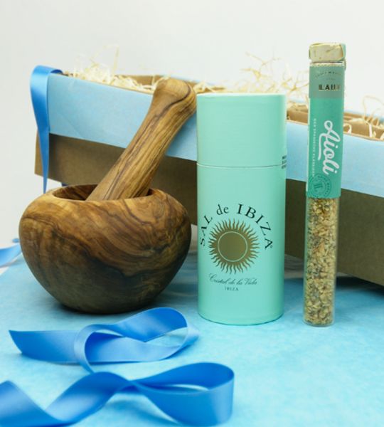 Mit den Zutaten und dem Accessoire in diesem Paket machen wir das Kochevent nicht nur zu einem kulinarischen sondern auch zu einem haptischen Erlebnis. Der geschmeidige Mörser aus Olivenholz ist optisch einfach purer mediterraner Lifestyle aber er liegt auch toll in der Hand und macht das Vermahlen zur Freude. Das Granito von Sal de Ibiza und das getrocknete Aioli sind zwei Klassiker aus der spanischen Küche, die ihnen helfen würzige mediterrane Marinaden und Dips zu zaubern.