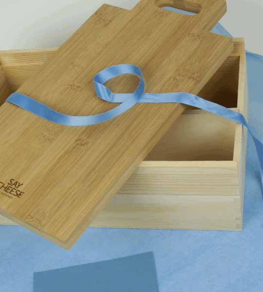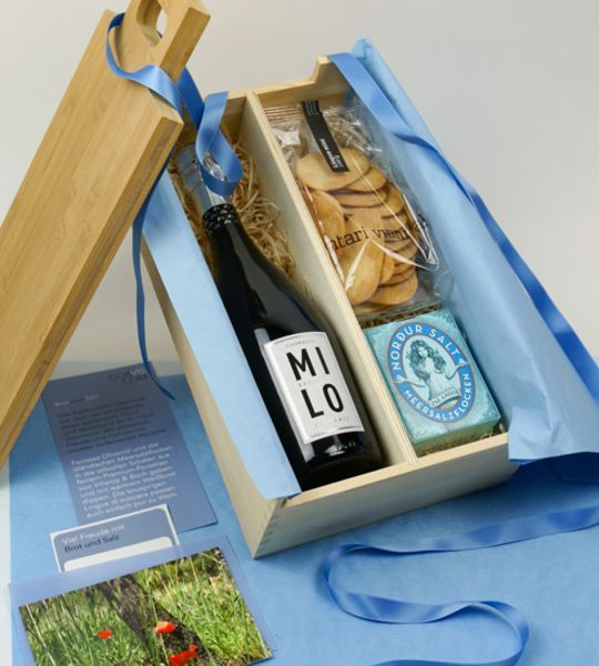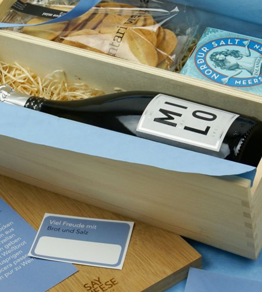 Ein erster Besuch – ein Grund zum Feiern. In diesem Paket haben Sie neben den traditionellen Geschenken Brot und Salz auch noch gleich ein stilvolles Getränk zum Anstoßen. Darüber hinaus ist die Verpackung ein hochwertiges Küchenutensil. Der Deckel der Say Cheese Holzbox ist ein stabiles Schneidebrett aus massivem Holz. Damit wird Ihr Geschenk lange in guter Erinnerung bleiben.
