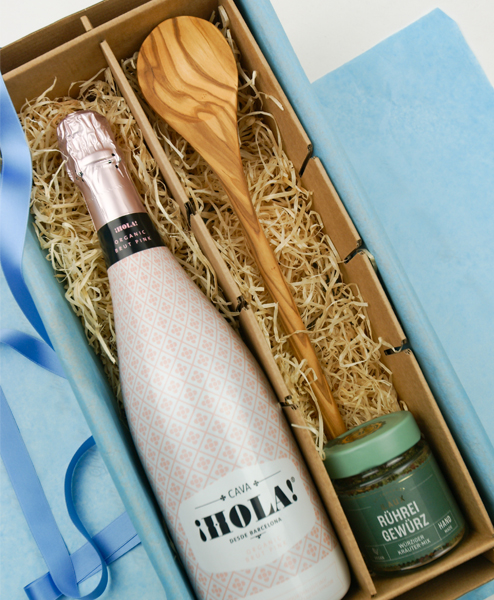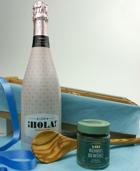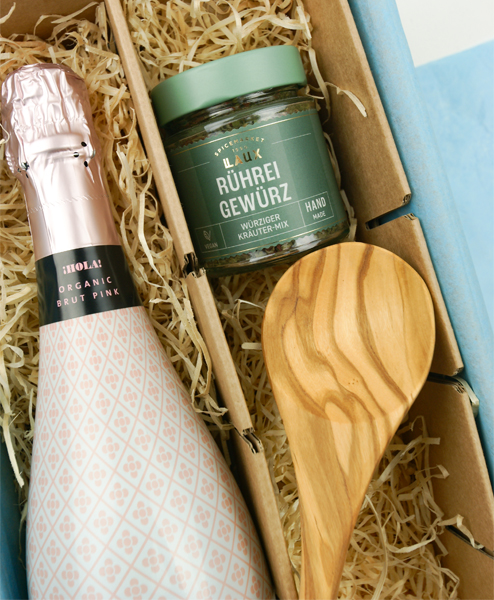 Feiern Sie einfach mal den Tag mit einem Sektfrühstück wie im Sternehotel. Sie haben es verdient. Mit dem ausgezeichneten Cava Hola Rosé Bio von Barcelona Brands und dem Rühreigewürz können Sie ein wunderbares Wochenende oder eine Auszeit einleiten. Der schöne Kochlöffel aus Olivenholz bringt noch ein bisschen mediterranes Feeling mit.