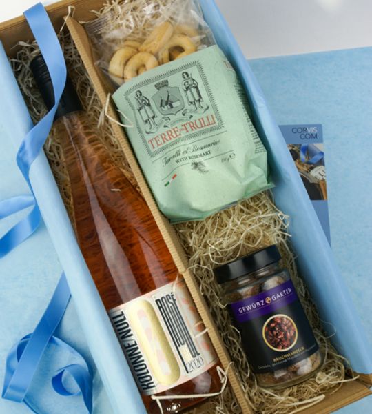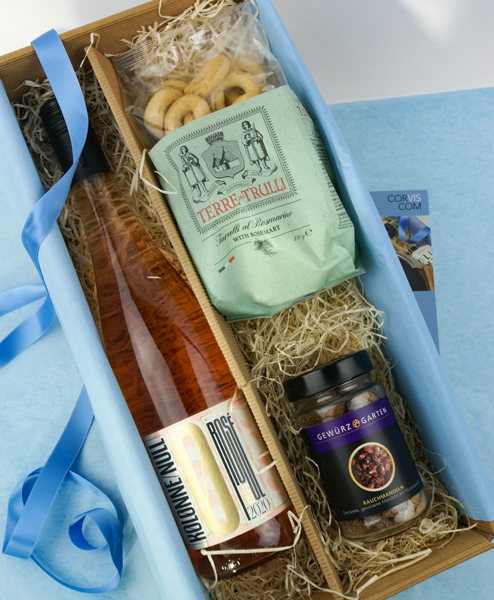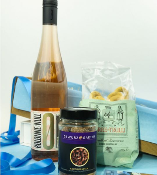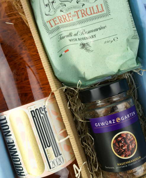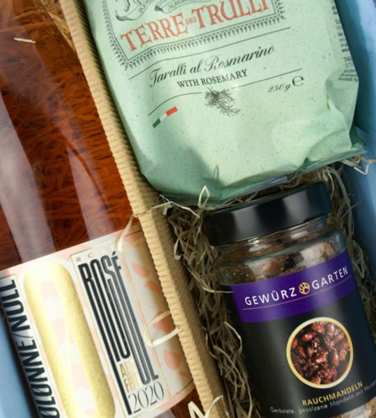 Mit diesem Sommergruß möchten wir Ihnen eine unbeschwerte Freude machen. Das kulinarische Geschenkpaket bringt mit dem frischen Rosé, den knusprigen Taralli und den feinen Rauchmandeln die Sonne des Südens mit.