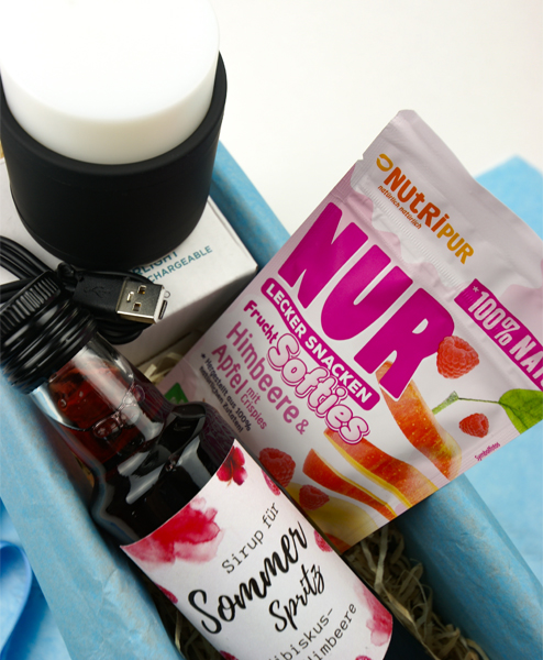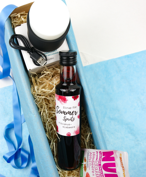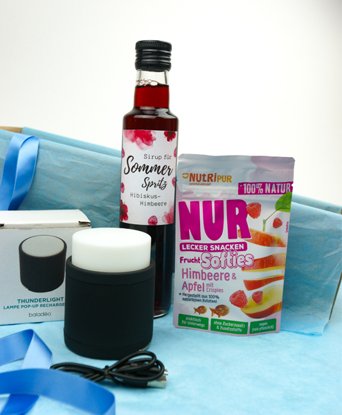 Verschenken Sie symbolisch eine Sommernacht unter dem Sternenhimmel. In diesem Geschenkpaket ist eine wiederaufladbare Pop-up Lampe von Baladéo, die sich für abendliche Outdoorevents geradezu anbietet. Sie erhellt den Gartentisch oder die Picknickdecke ohne Kabel und ist wieder aufladbar. Aus dem Sommerspritz mit Hibiskus und Himbeere können Sie einen wunderbaren, erfrischenden Drink mixen. Je nach Gusto mit oder ohne Alkohol, denn der Shrub Sommerspritz ist von Hause aus ohne Alkohol. Natürlich darf auch etwas zum Knabbern nicht fehlen und hier sind es die Fruchtsofties von Nutripur.