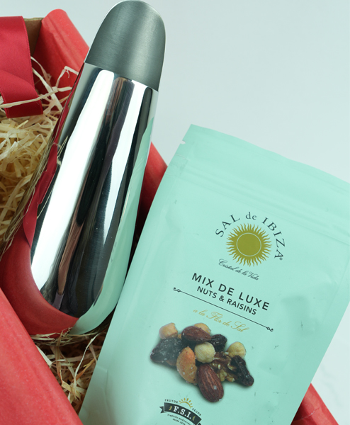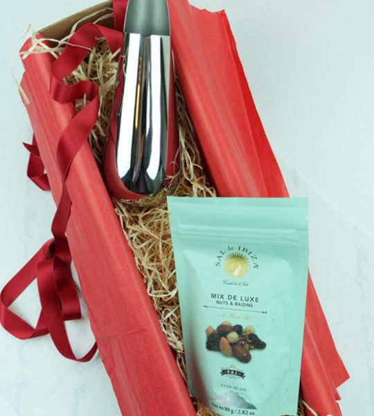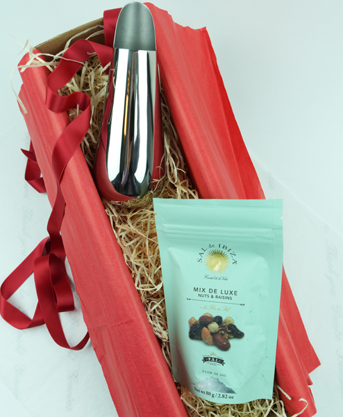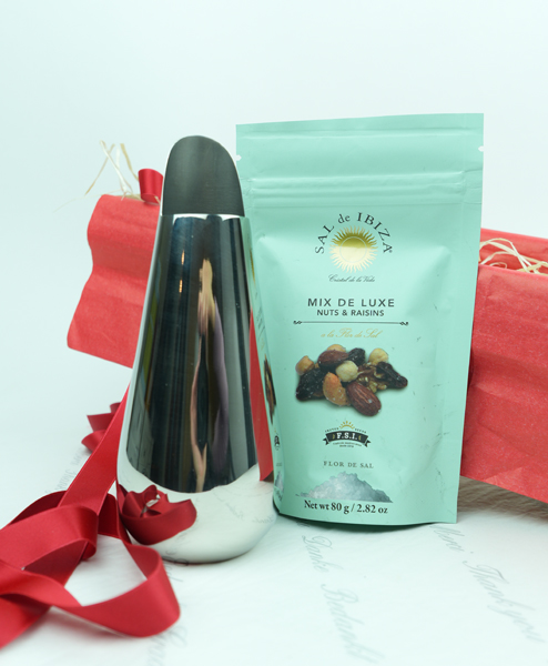 In der edlen Schütte Schütte von Philippi kann man jedes Knabberzeug stilvoll präsentieren und spendabel ist sie auch. Sie verteilt den Inhalt hygienisch und großzügig. Da muss keiner mehr in die Schale greifen oder mit dem Löffel hantieren. Das schöne Edelstahlobjekt ist ein Hingucker und ein praktischer Helfer zugleich, der auf keinem Cocktailtisch fehlen sollte. Und das nicht nur zur Weihnachtszeit. Der Mix Deluxe von Sal de Ibiza ist eine angemessene Befüllung. Natürlich gibt es noch Alternativen, je nach Geschmack.