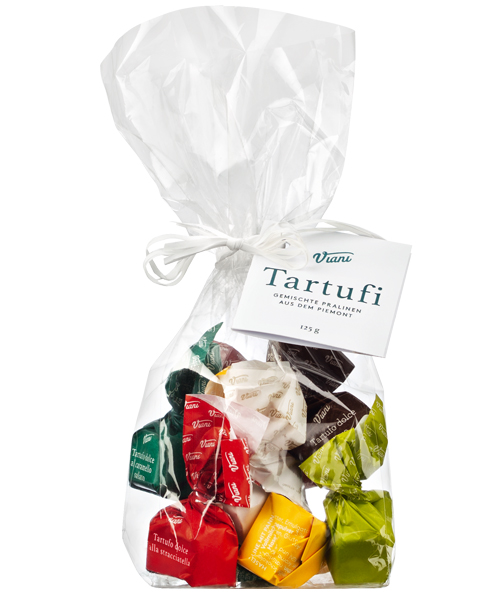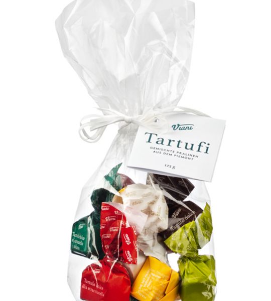 Eine weitere, köstliche Erfindung aus dem Piemont sind die „Tartufi Dolci – süße Trüffel“. Ihr Hauptbestandteil ist die große, runde Piemonteser Haselnuss. Nach traditionellem Rezept entsteht daraus eine Praline mit unnachahmlich weichem Biss. In der schönen Geschenktüte sind die Sorten Caramello e nocciole salate, Panna cotta und Stracciatella. Außerdem noch jeweils eine Praline der Sorten Pistacchio, Nero elegant und Bianco elegant. Leider nicht kalorien- aber dafür glutenfrei.
